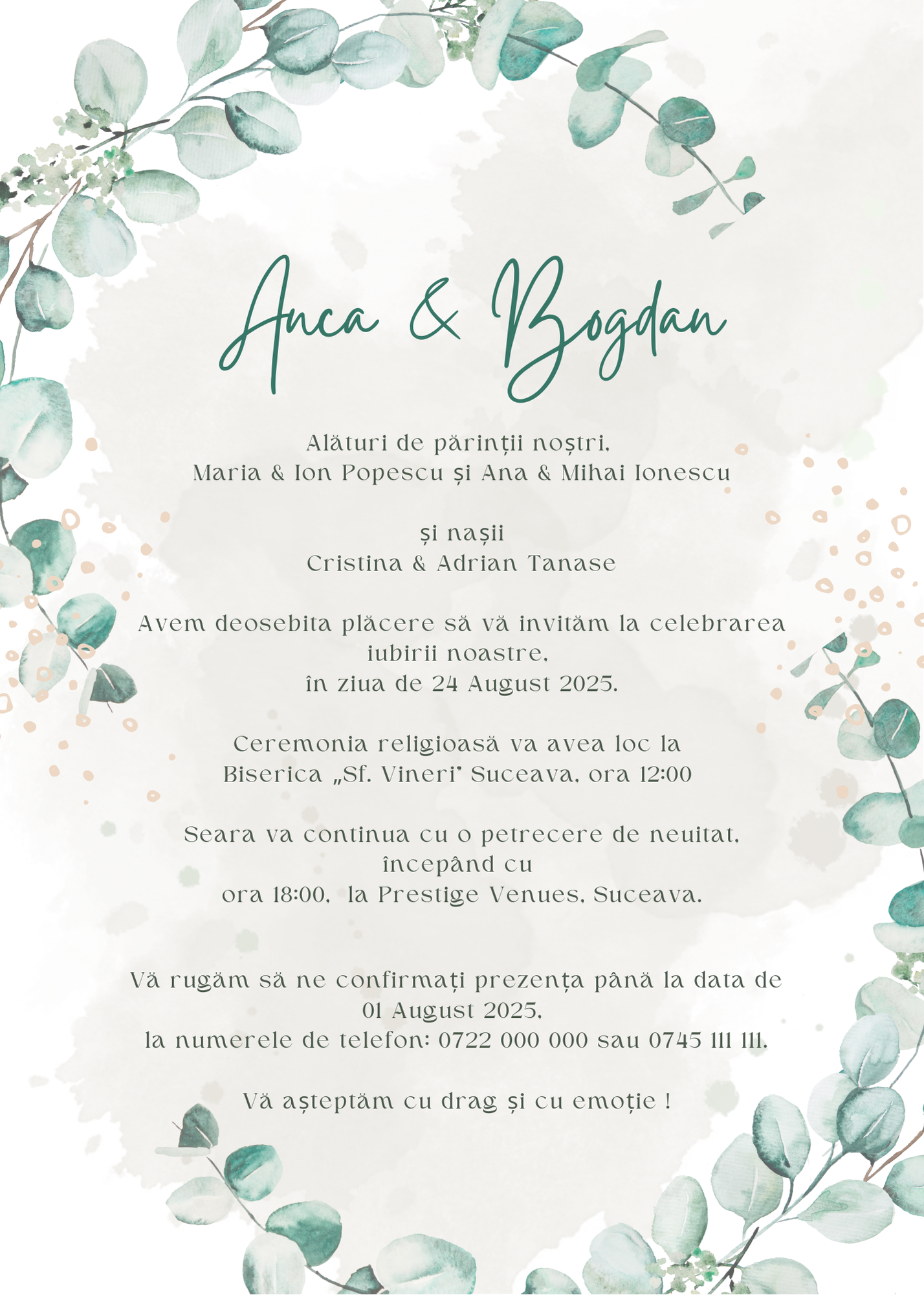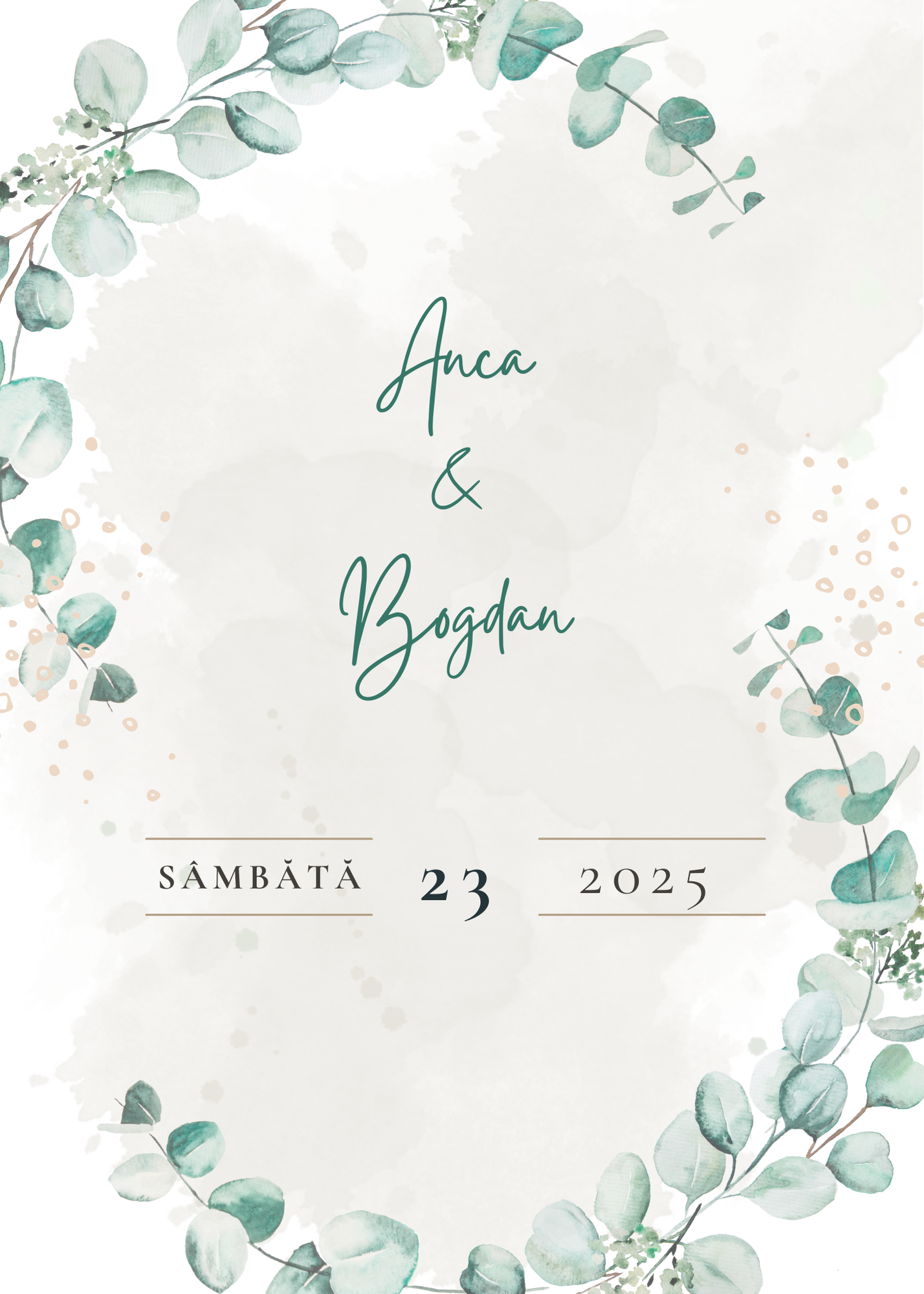 Invitația poate fi adaptată cu numele voastre, data și locația nunții, plus un mesaj personalizat, creând astfel un cadru unic pentru povestea voastră de dragoste.